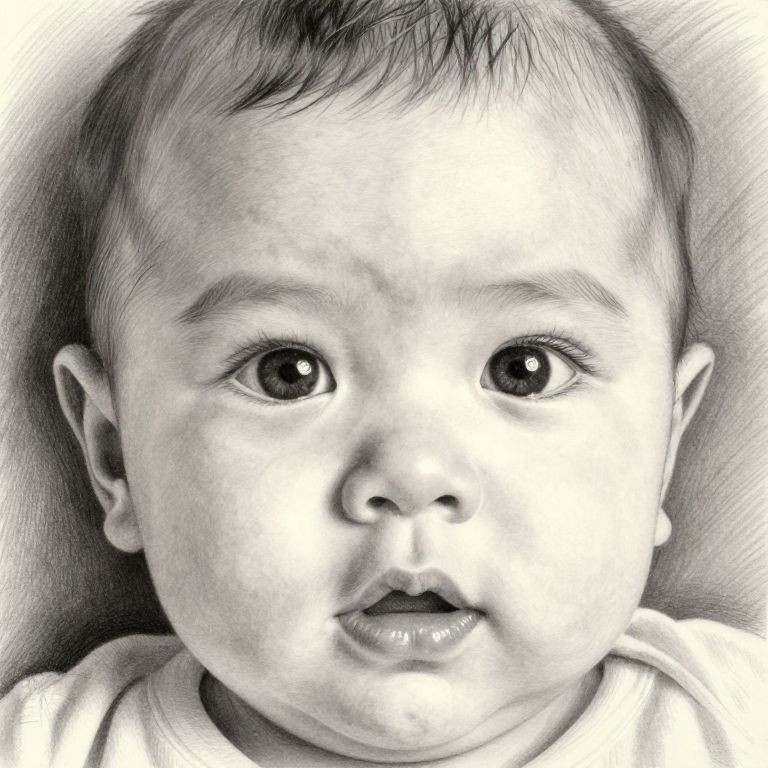 A stunningly realistic pencil portrait captures the mesmerizing gaze of a baby, rendered with exquisite detail and dramatic lighting that accentuates the innocence and wonder in its eyes.