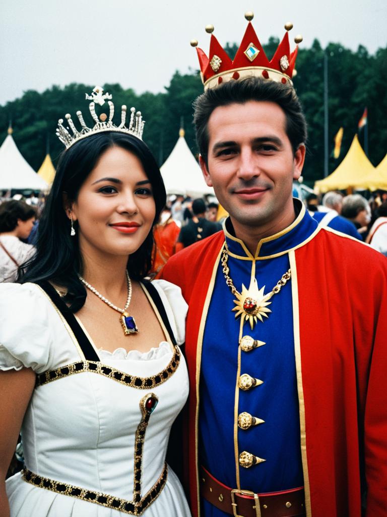 A couple dressed in king and queen costumes posing at a lively festival. The woman wears a white gown with black and gold trim, a jeweled necklace, and a silver crown. The man is in a royal blue outfit with gold accents and red robe, topped with a red crown. Festival tents and crowd are visible in the background.
