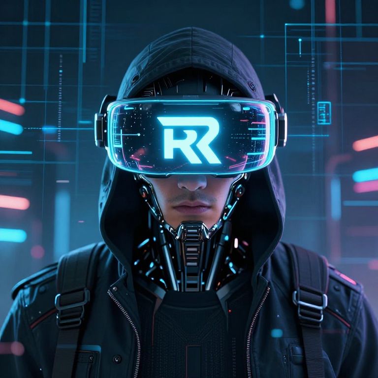 Rxking digital hacker avatar in virtual reality, rxking logo integrated into neon cyber grid background, glowing data streams, intense focused expression, intricate cybernetic enhancements, dark ambiance, futuristic cyberpunk art style