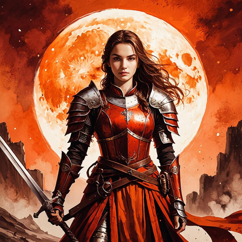 A warrior young woman wearing red medieval armor with shoulder plates and a flowing sash, holding a sword in each hand, standing confidently in front of a large warm glowing orange moon, watercolor anime style, dramatic natural lighting, textured brush strokes on paper, red and orange color scheme
