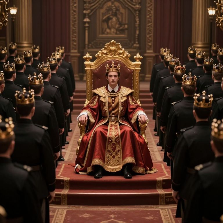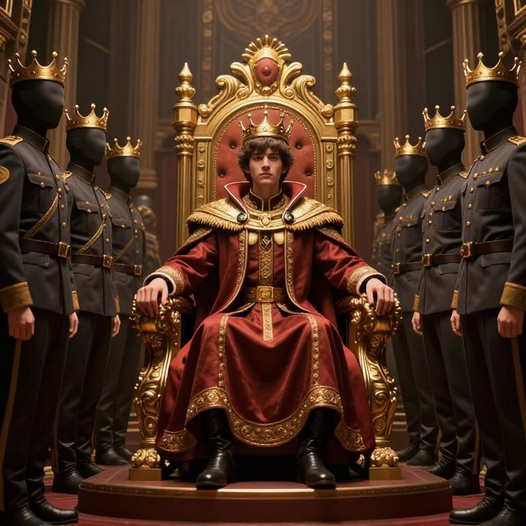 In a surreal 3D-rendered throne room bathed in dramatic lighting, a young king adorned in regal attire and a golden crown sits solemnly on an ornate throne, flanked by an array of identical, headless figures in uniform, each crowned and mirrored in a haunting display of loyalty and reflection.