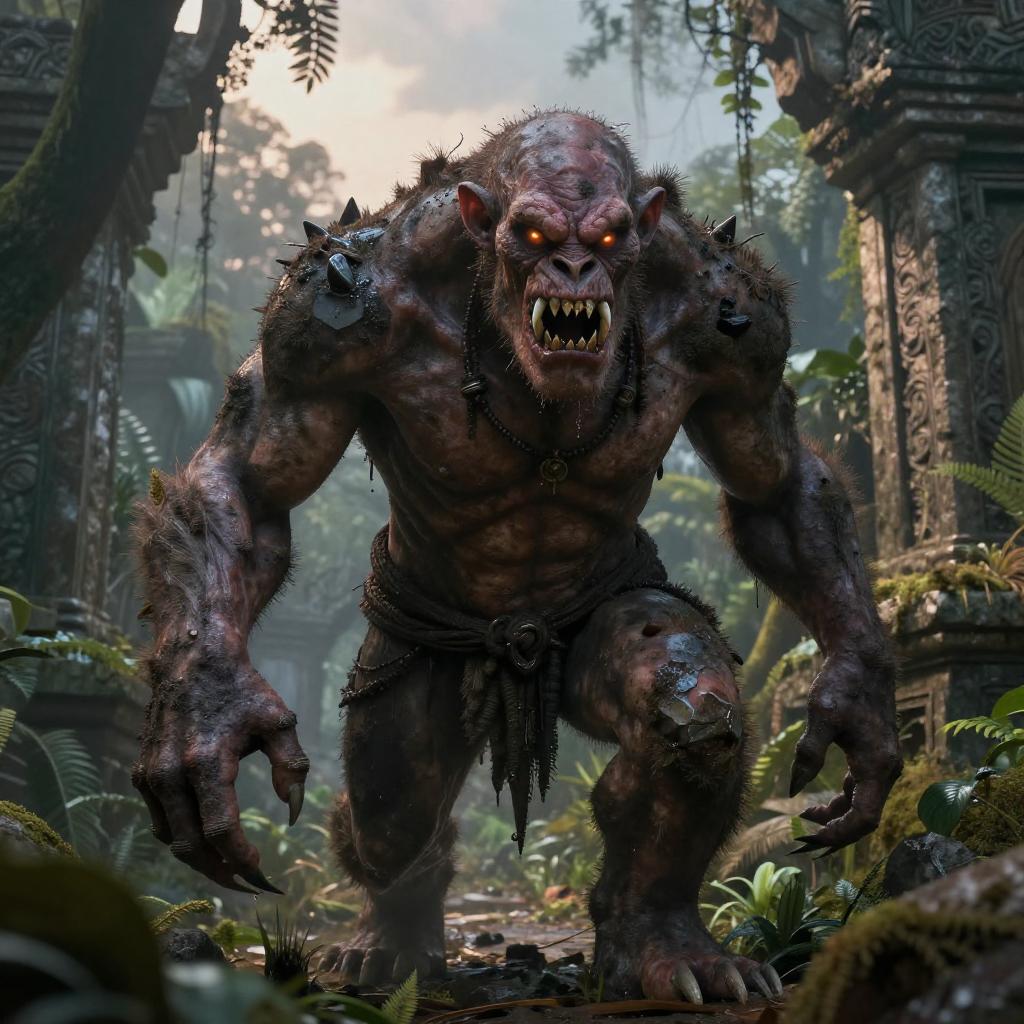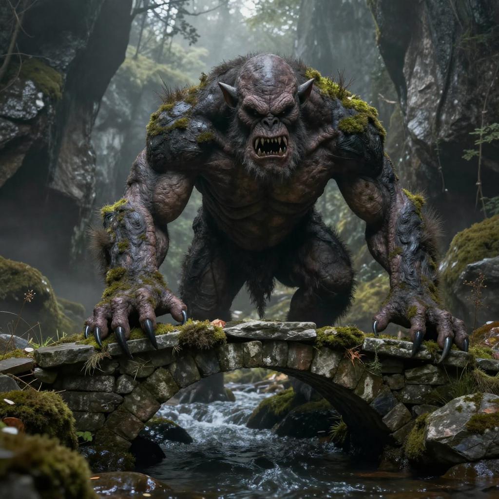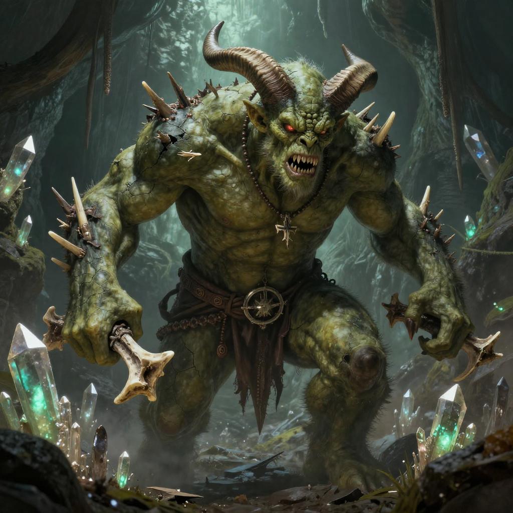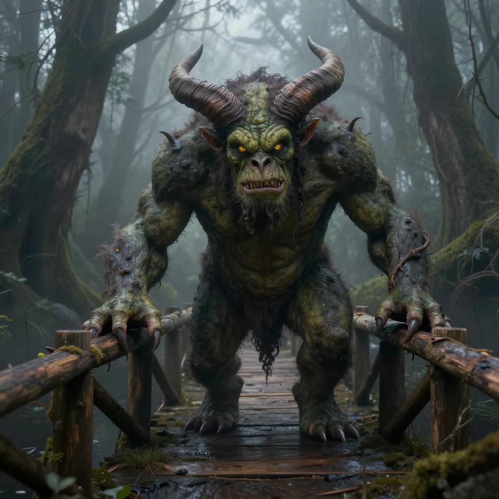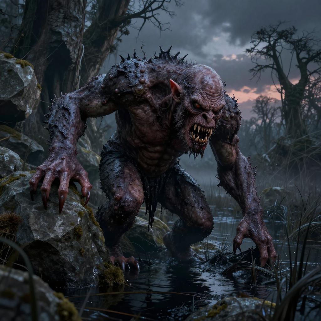 An intimidating troll clinging to jagged rocks above a black marsh, in a cursed bog at twilight, with slimy mottled hide, poisonous warts, and dripping fangs, a vile and sinister atmosphere, detailed textures, highly realistic, dark fantasy art
