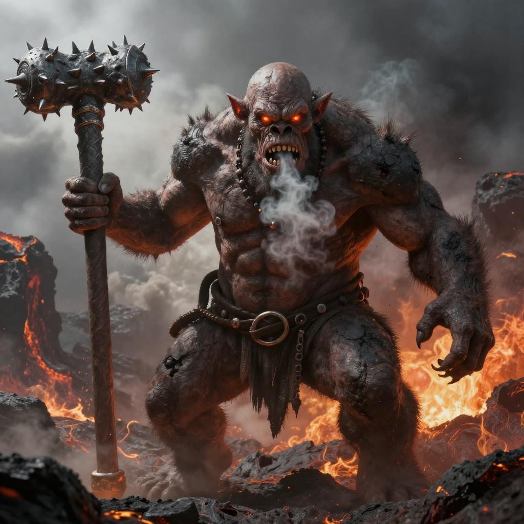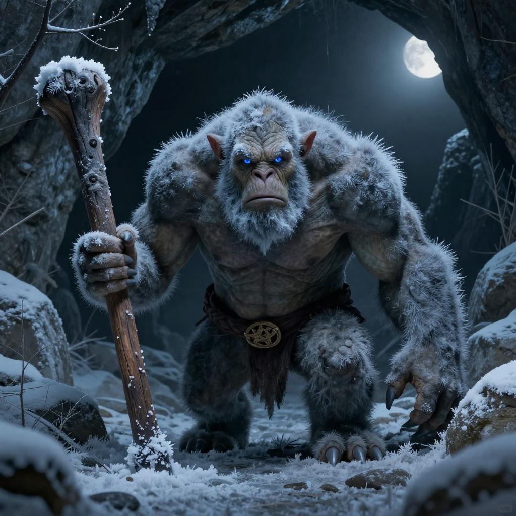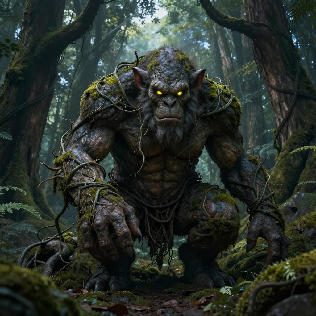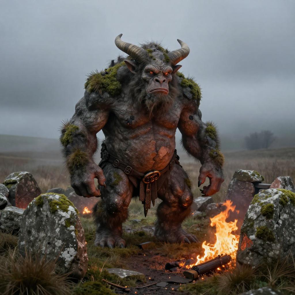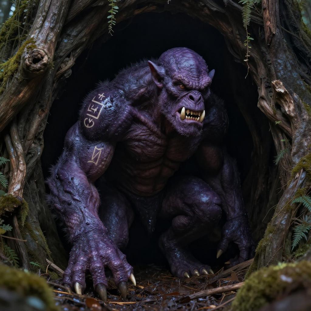 An intimidating troll clinging to jagged rocks above a black marsh, in a cursed bog at twilight, with slimy mottled hide, poisonous warts, and dripping fangs, a vile and sinister atmosphere, detailed textures, highly realistic, dark fantasy art