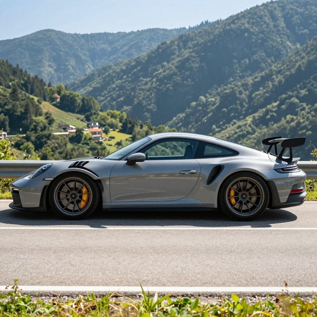 GT3 RS side view, sleek racing car parked on a sunlit mountain road, high detail, vibrant colors, sharp reflections on glossy paint, hyper realistic style