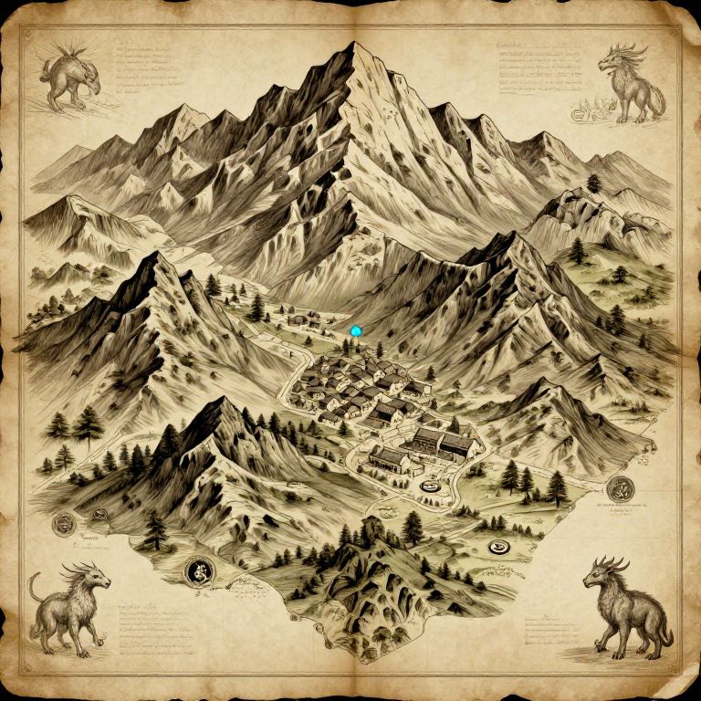 Mountain map dnd styled as an old explorer's chart, featuring dramatic mountain ranges, secluded villages nestled in valleys, secret dungeons indicated by cryptic icons, mythical creatures drawn in the margins, earthy color palette with detailed shading for elevation and terrain textures