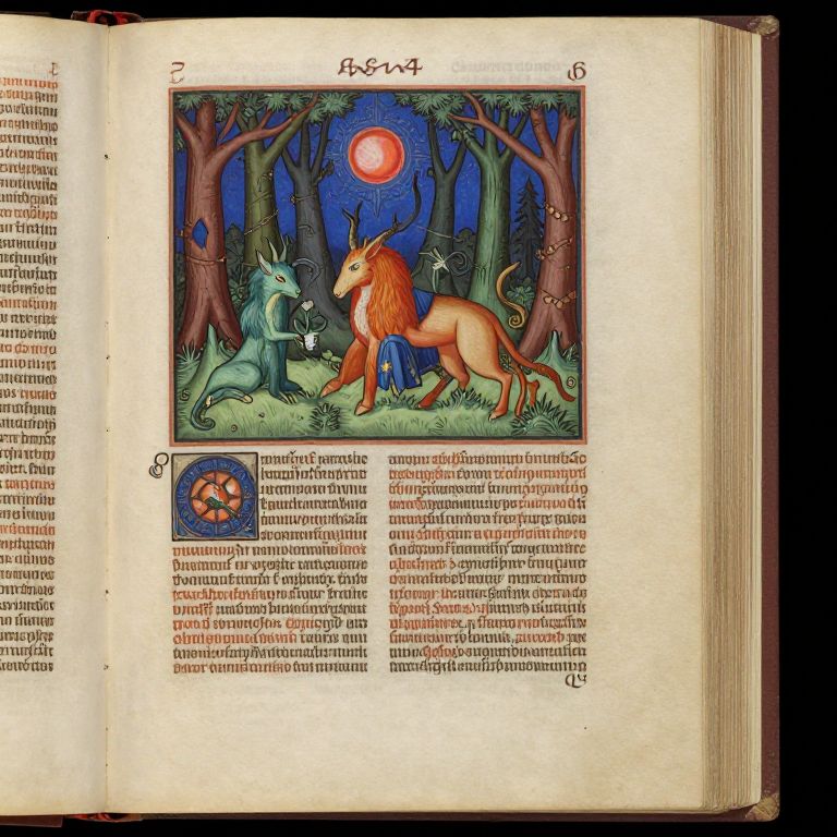 Illustrated page from an ancient book: a vibrant forest scene with a full moon, green wolf, and orange lion, surrounded by text in an ancient