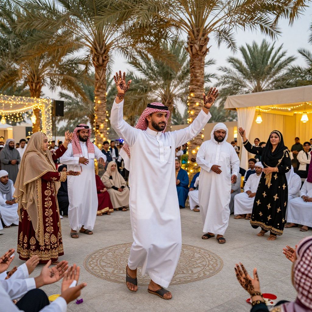 KSA cultural festival scene with traditional dances, men and women in traditional Saudi attire performing Ardah, intricate henna designs on hands, majestic palm trees surrounding the gathering, elaborate decorations with lights and lanterns, joyful expressions on faces