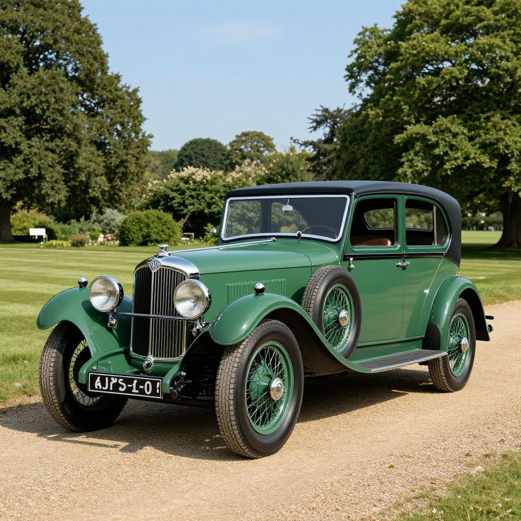 1928 Bentley 6½-Litre Standard Six Saloon, chassis no. FA2504, gleams in vibrant green as it rests elegantly on a gravel path, surrounded by lush greenery and trees under a clear blue sky.