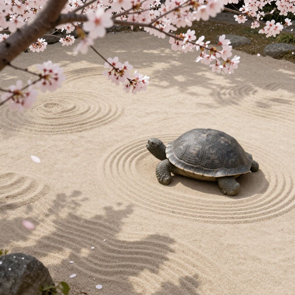 Craft an image showcasing a tranquil Zen garden in the style of traditional Japanese ink painting, with cherry blossoms drifting elegantly around a grand stone tortoise. From above, this ephemeral scene captures nature's beauty as it intertwines through meticulously arranged sand patterns reminiscent of ocean waves. This peaceful tableau inspires feelings of serenity and introspection, inviting viewers to pause and immerse themselves in the fleeting moment under the gentle spring sun filtering through the branches overhead.