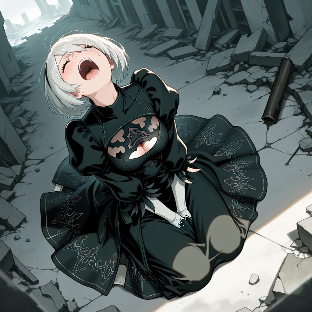 (masterpiece), high quality, super detailed, 4k, sharp focus, 1girl, short hair, white hair, 2B, adult, yorha no. 2 type b, tear, sad, sorrow, crying, teary, Nier Automata, sit in ground, (on her knees), (from above), (ruins destroyed) city background, in front, mouth totally open, ((screaming)), hands between thighs, (long skirt), head back, ((looking at sky)), tears, eyes closed