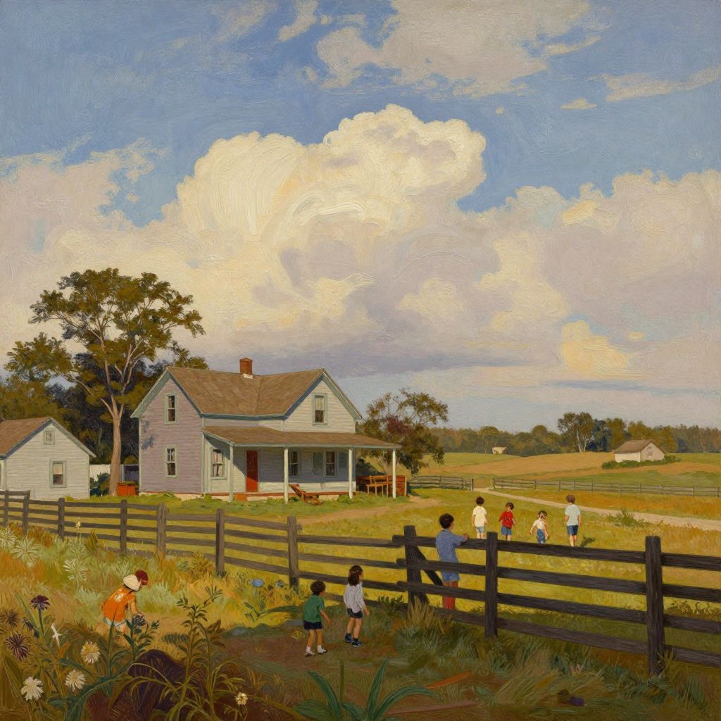 Norman Rockwell landscape showcasing a vibrant rural American countryside in mid-20th century style, detailed brush strokes, warm golden sunlight illuminating a farmhouse, children playing near a wooden fence, rich textured skies with fluffy clouds, nostalgic and heartwarming atmosphere.