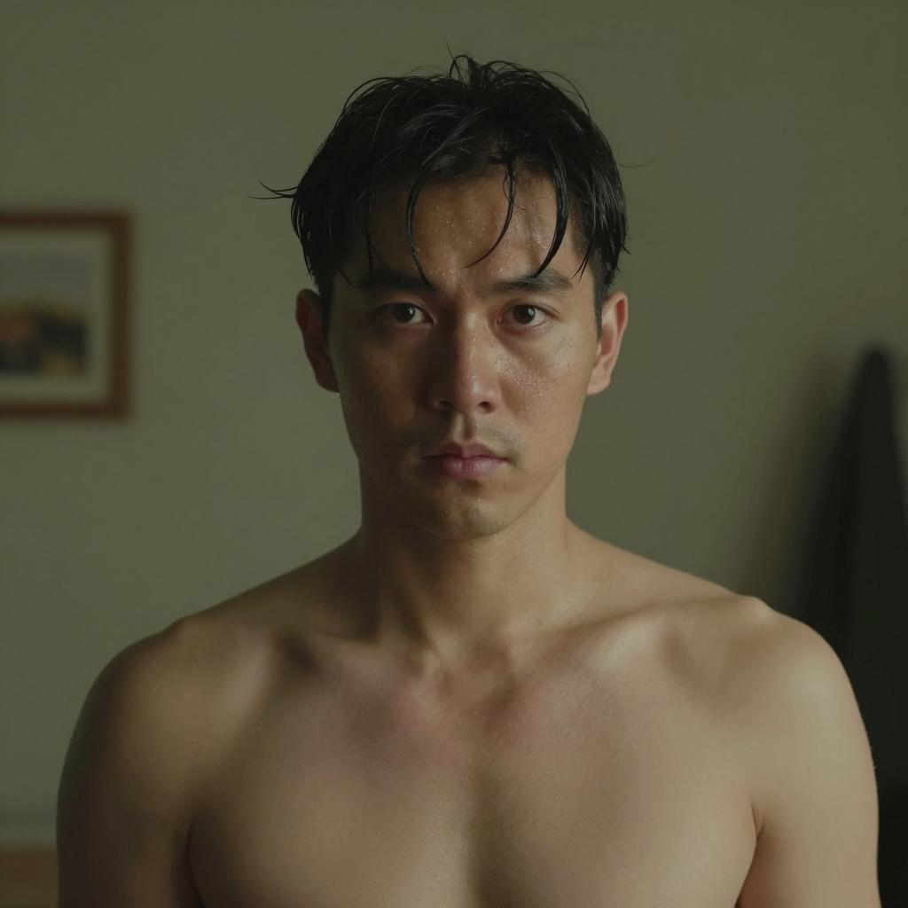 Shirtless man with short dark hair and light skin, holding a small, round, brown object in his right hand. He has a focused expression. Background includes ured, dark brown wall and a wooden table. Lighting is warm.