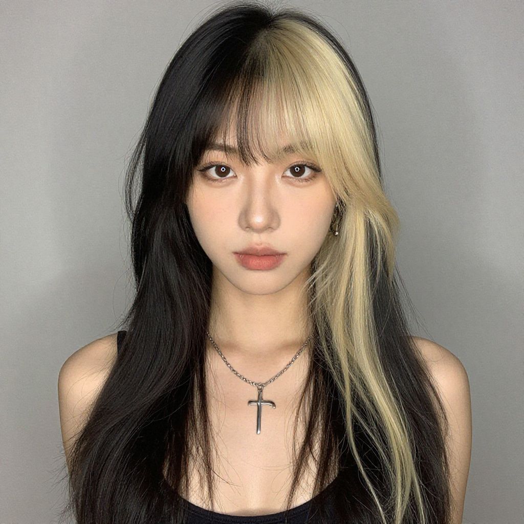 Photograph of an East Asian woman with long, straight hair that is half black and half platinum blonde. She has straight bangs that match her hair color. Her skin is fair, and she has light brown eyes and neutral-toned lips. She wears a black tank top and a silver necklace with a cross pendant. The background is a plain, light gray color. Her expression is neutral, and the image has a slight digital enhancement, making her features appear slightly more vivid. The lighting is even, highlighting her hair's contrast.