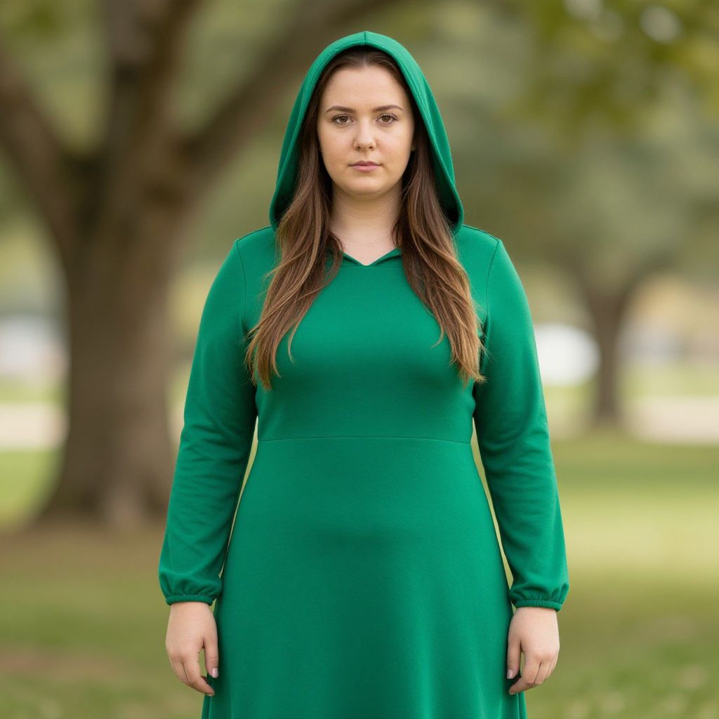Plus size fiona costume, 1girl, solo, plant, tree, green dress, hood, dress, standing, long hair, outdoors, looking at viewer, blurry background, hood up, brown hair, blurry, day, closed mouth, long sleeves