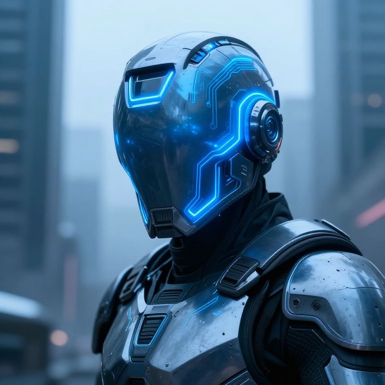 Futuristic helmet armor glowing with neon blue lights, sleek metallic surface with intricate circuit patterns, worn by a cybernetic warrior in a dystopian cityscape, ambient fog and towering skyscrapers in the background.