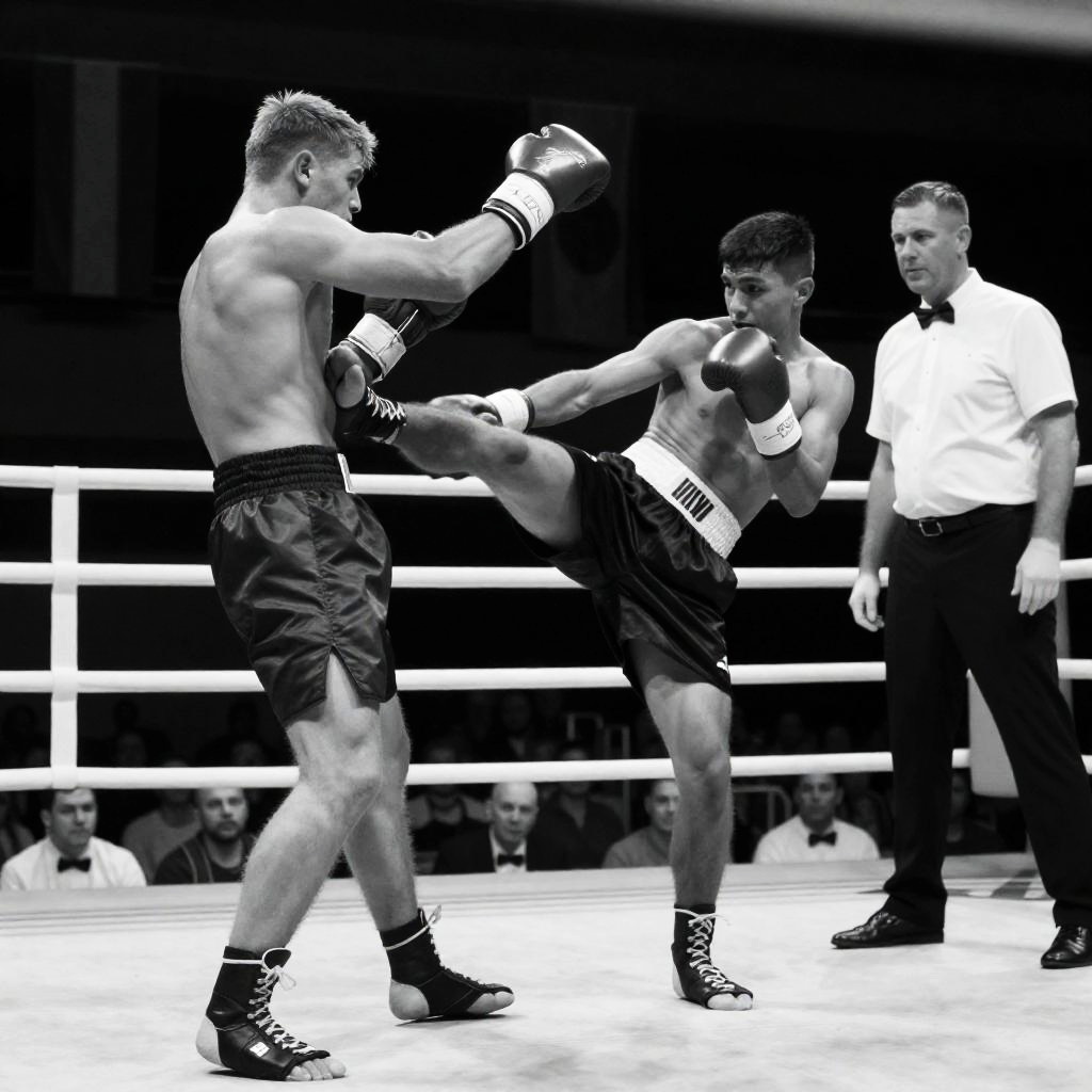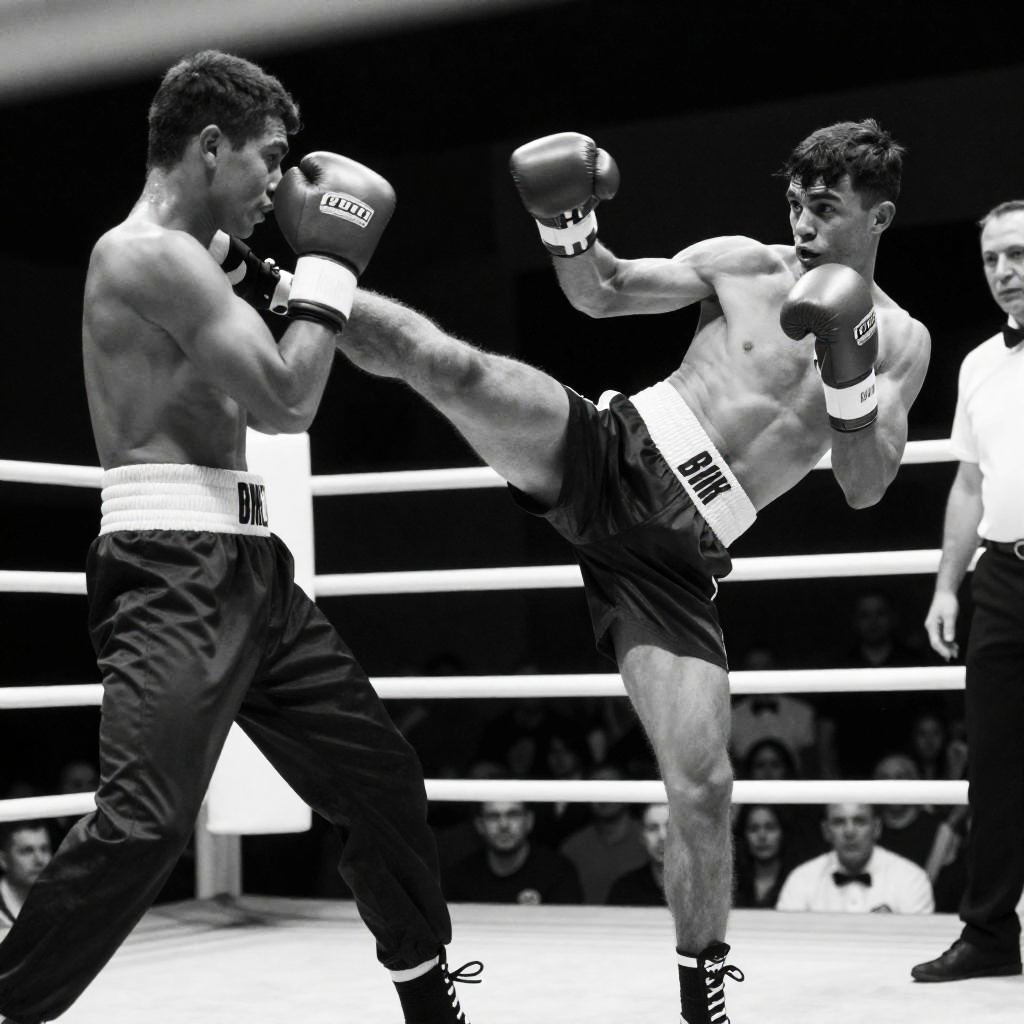 Black-and-white photograph of a boxing match. Shirtless male boxer with blonde hair, defensive stance, left arm raised. Opponent kicks high, right leg extended, black pants. Referee in white shirt, black pants, right side. Audience, flags in background.