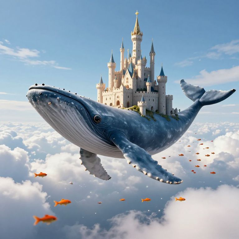 Giant whale-like creature soaring through the sky with its mouth agape, supporting a sprawling castle atop its back, surrounded by numerous small orange fish swimming freely among fluffy white clouds.