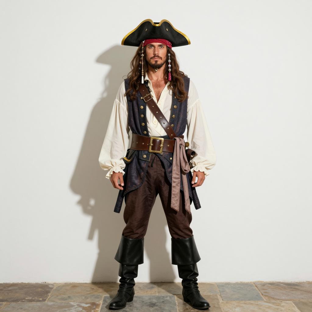 Pirate dress costume, photorealistic image, male, standing, full body, pirate costume, 18th century pirate, white shirt, brown pants, black boots, large tricorn hat with yellow trim, red bandana, black sash across chest, brown belt with buckle, brown sash tied around waist, long brown hair, serious expression, shadow on wall, outdoor, daytime, realistic ure, detailed clothing, historical costume, full frontal view, slight shadow under hat, stone ground, white background
