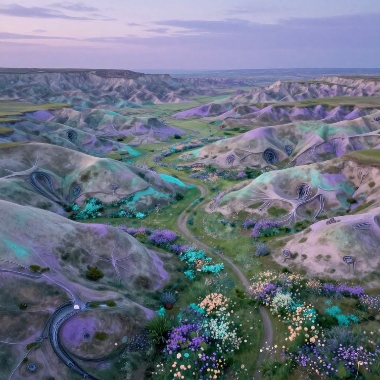 A surreal landscape merges impressionistic techniques with an unsettling biomechanical style, creating an otherworldly panorama. From an aerial perspective, the scene reveals undulating hills that seamlessly transition from organic landscapes into metallic structures, pulsating with life-like veins. Vibrant wildflowers flourish in verdant meadows beneath a twilight sky, their pastel hues of lavender, teal, and pale orange blending harmoniously across the canvas to emphasize the scene's tranquility. This ancient meeting ground where two distinct worlds collide evokes both wonder and unease, as if the viewer is witnessing an ethereal fusion of nature's beauty and unsettling alien architecture.