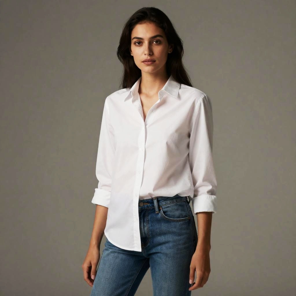 Cotton Shirt Woman, a woman in a white shirt and jeans posing for a picture