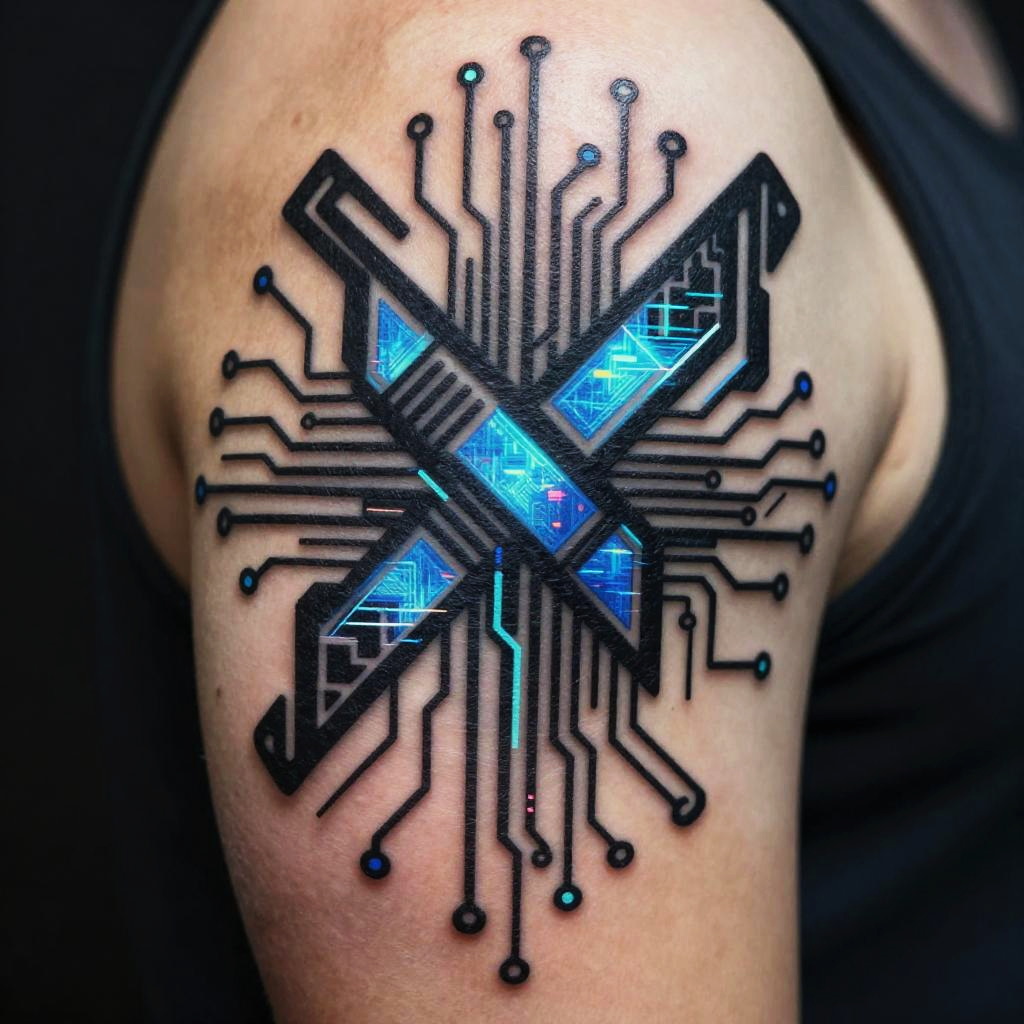 AI create tattoo inspired by digital art and circuit boards, abstract geometric shapes intertwined with flowing organic lines, bold black and neon blue colors, sharp clean lines with slight glitch effects, modern tech-sci-fi aesthetic, ultra-detailed high resolution