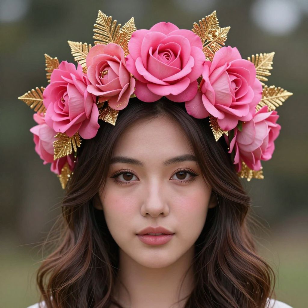 A woman wears a stunning floral headpiece featuring vibrant pink roses and intricate gold star-shaped leaves, crafted in a high-definition, digital art style that highlights the vivid colors and detailed textures against a softly blurred natural background.