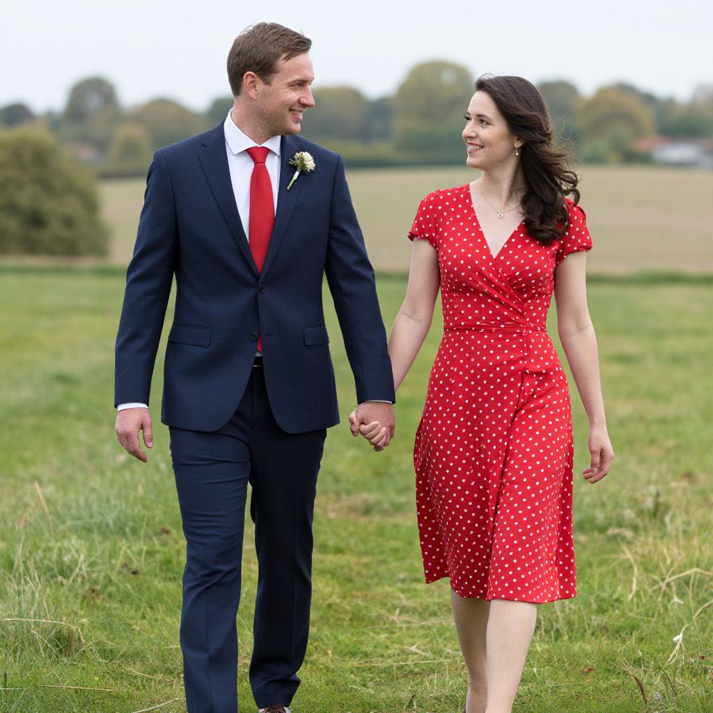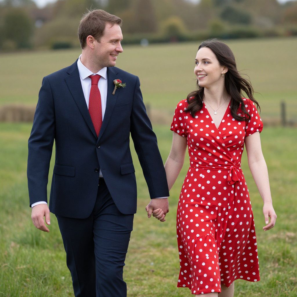 Elegantly dressed couple strolling hand-in-hand through a serene Bristol field, the man in a navy suit with a red tie and boutonniere, and the woman in a vibrant red polka-dot dress, both smiling warmly as they share a joyful moment.