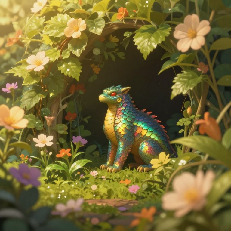 Visualize an impressionistic garden scene, observed from a unique perspective akin to a tiny creature's view nestled among verdant foliage. Soft, diffused light bathes the landscape in a golden hue, casting a warm glow on delicate petals and glistening leaves. Amidst this serene setting, an ancient mythical beast arises from a concealed nook, its scales reflecting the garden's vibrant hues with radiant iridescence. This harmonious blend of serenity and awe-inspiring power evokes a rich emotional spectrum, beckoning viewers to explore the enigmatic wonders that reside within nature's tranquil recesses.