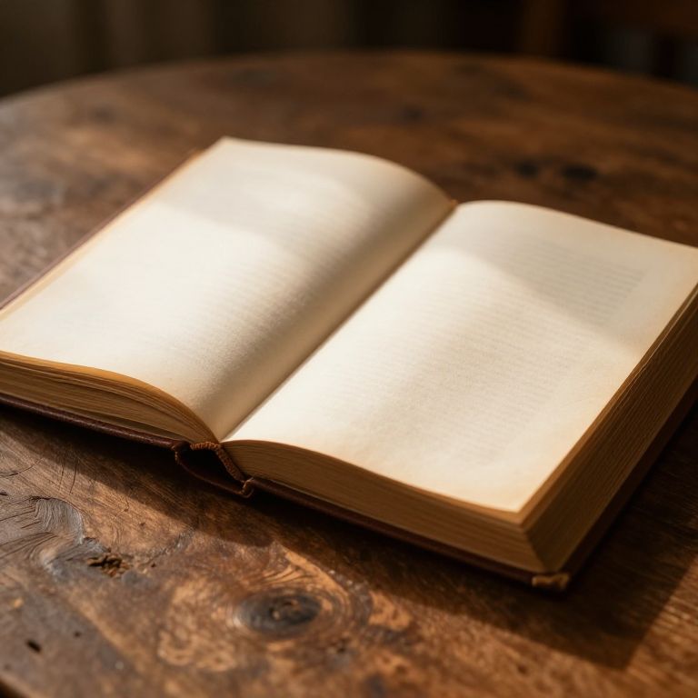 Photograph of an open, illuminated book on a rustic, wooden table, showcasing its creamy, slightly yellowed pages with warm, natural light highlighting the