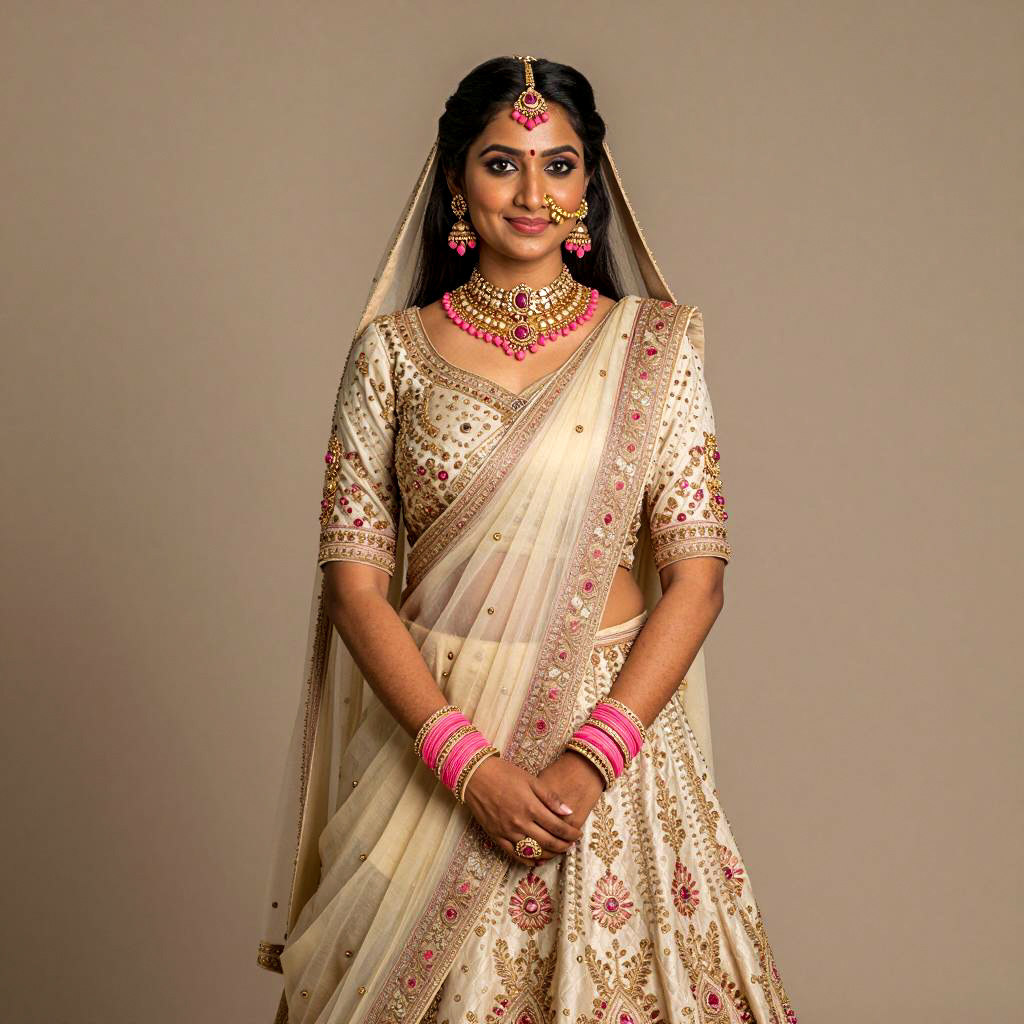 Engagement simple lehenga, photograph of a South Asian woman, standing, traditional Indian wedding attire, cream and pink saree with gold embroidery, matching pink and gold jewelry, including a maang tikka, earrings, necklace, bangles, and rings, long black hair, hair partially covered by saree pallu, light skin, neutral background, soft smile, hands gently clasped, traditional Indian makeup, soft lighting, elegant and cultural, portrait orientation, simple and minimalistic setting
