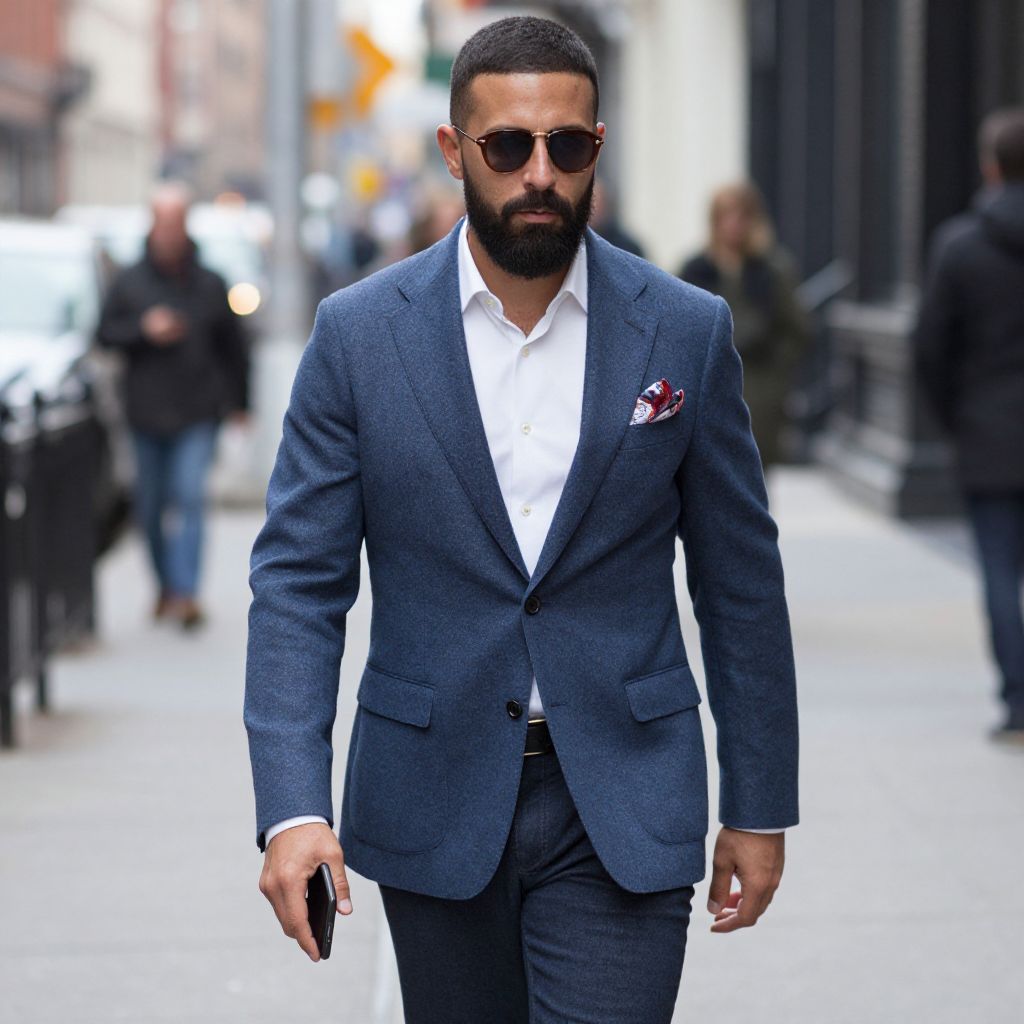 A stylish man with short black hair and a full beard walks on a sidewalk in SoHo, holding his cell phone, wearing a blue Ferragamo blazer, white button-up shirt, and a floral pocket square.