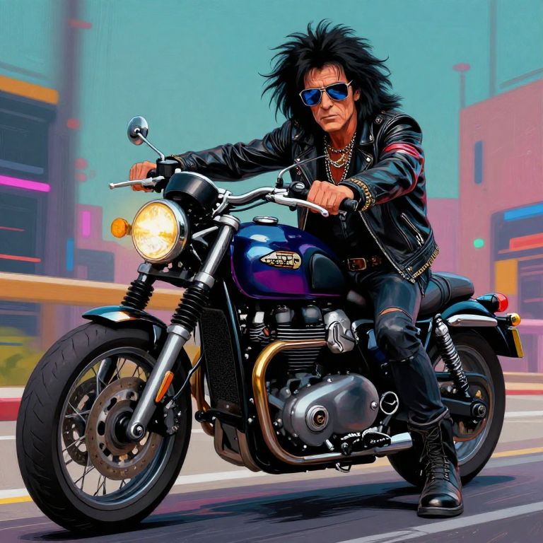 Triumph alice cooper sunglass, motorcycle , biker, Cruser full color painting of squatting cyberpunk,
