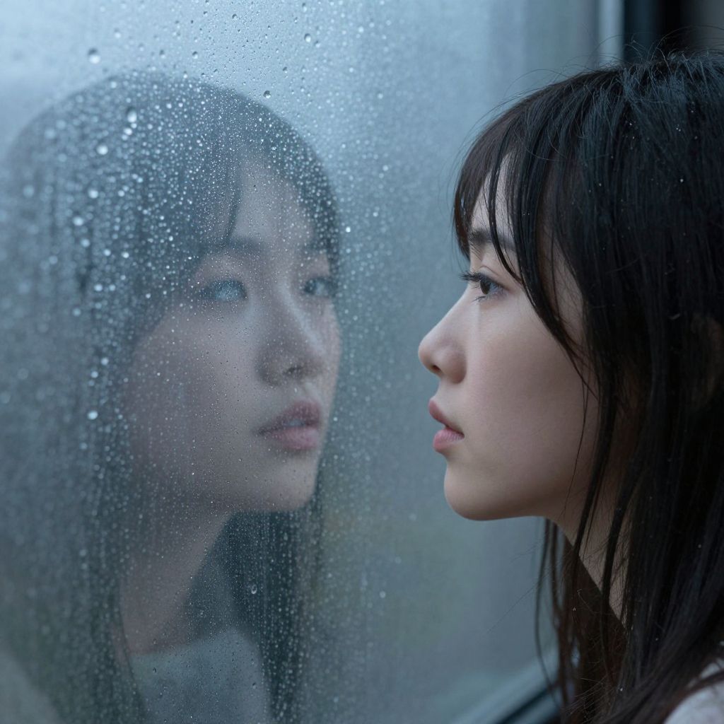 Photograph of an East Asian woman with fair skin and long, straight black hair gazing at her reflection in a wet, fogged-up window. Her profile is visible on the right, showing a contemplative expression with slightly parted lips. Her reflection, slightly blurred and mirrored, shows her face from the front, with droplets of rainwater covering the glass. The background is blurry and gray, suggesting an overcast or rainy day. The image captures a mood of introspection and melancholy, with a focus on the contrast between her clear profile and the blurry, rain-speckled reflection.