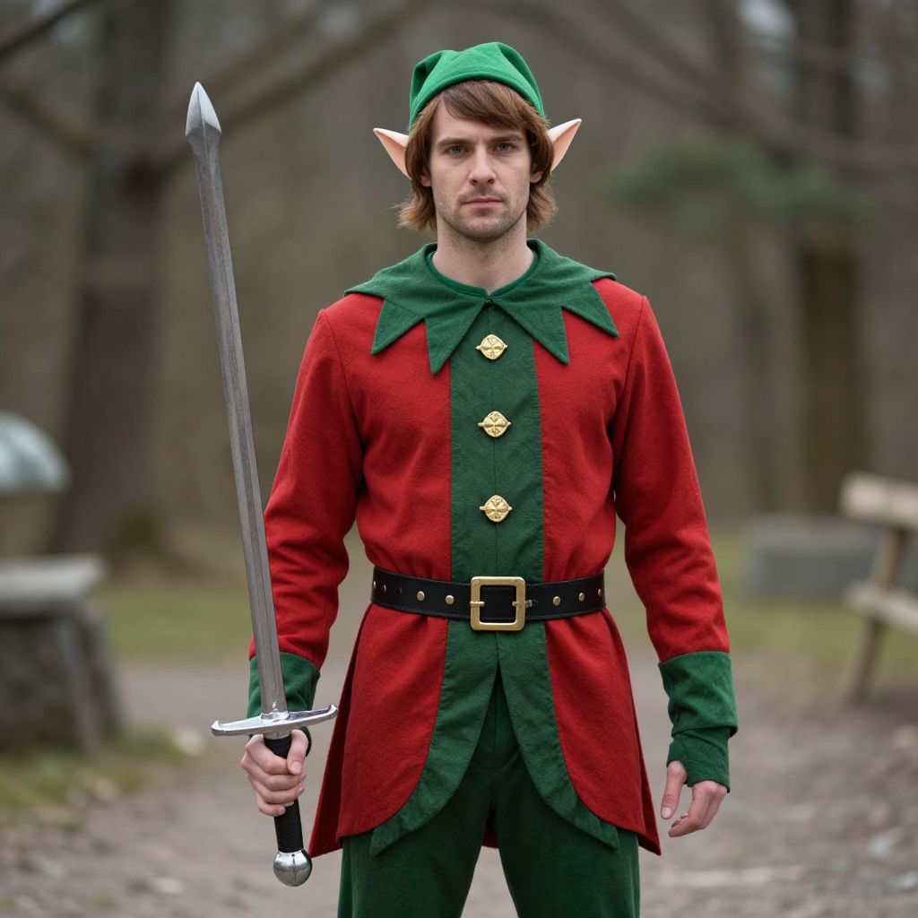 Elf Hunter Costume, man in a red and green outfit with a sword