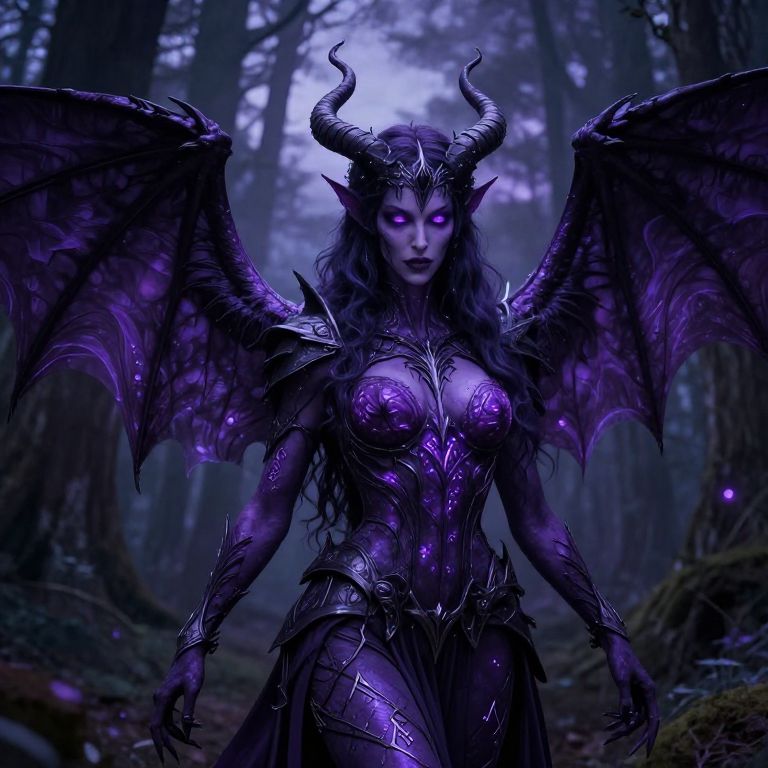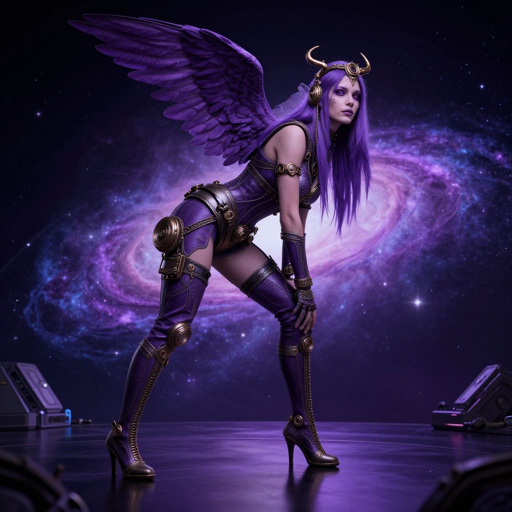 Photorealistic digital artwork of a fantasy female figure with long purple hair, large black wings, and a golden horned headpiece. She wears a form-fitting, black corset with gold armor accents, thigh-high boots, and high heels. Her skin is pale, and she leans forward with a confident, alluring expression. The background features a vibrant, purple and blue galaxy with swirling star formations. The scene is set on a dark stage with spotlight beams on the floor, enhancing her mystical, otherworldly aura. The overall color palette is dominated by purples and blacks, emphasizing the cosmic theme.
