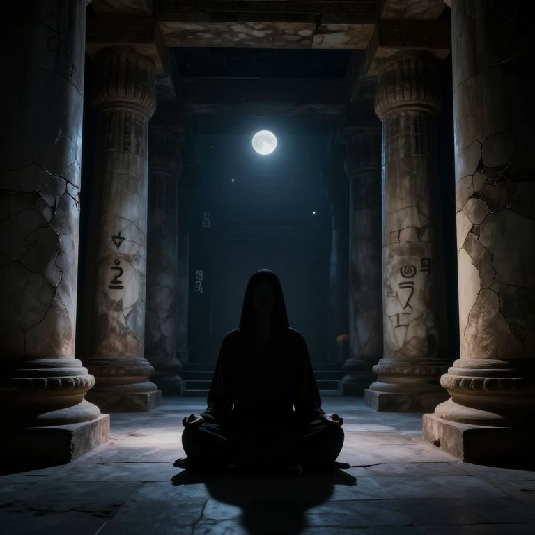 Silhouetted figure meditating in a dimly lit, ancient temple with cracked columns, moonlight illuminating the background through a dark doorway.