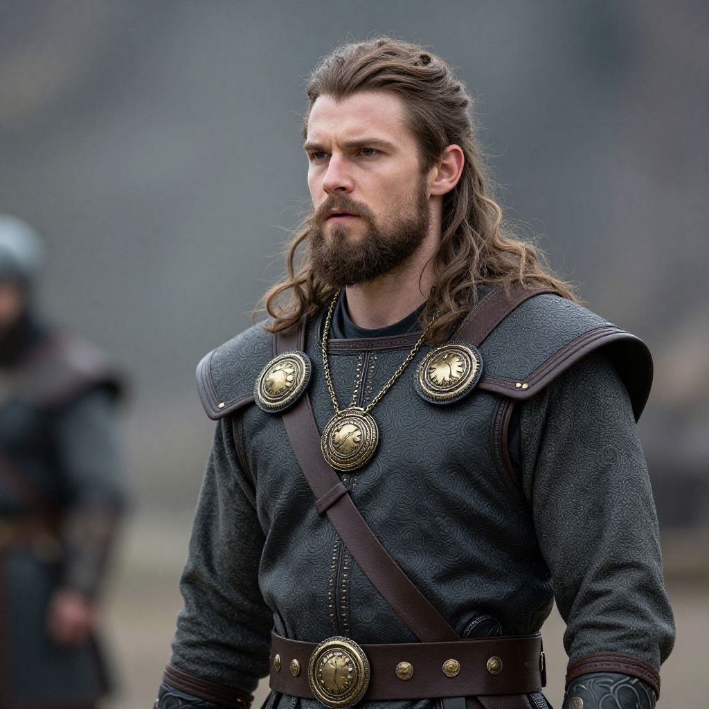 Photograph of a bearded, long-haired man with intense gaze, wearing a dark grey, armored tunic with large, ornate bronze medall
