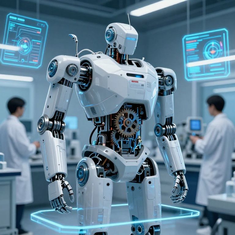 Photograph of a futuristic, white, humanoid robot with metallic joints and blue accents, standing on a glowing blue hexagonal platform in a high-tech lab. The robot has a sleek, boxy design with visible gears and circuitry in its chest. Two blurred Asian men in white lab coats work in the background, surrounded by glowing blue holographic screens and bright fluorescent lighting. The lab has a sterile, modern aesthetic with gray walls and white equipment. The image has a sci-fi, high-tech feel.