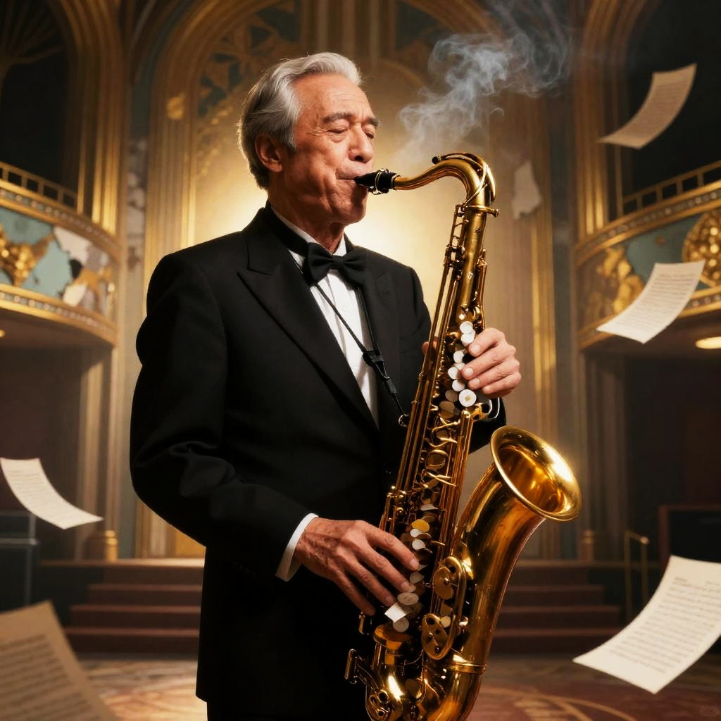 Dynamic illustration of elderly jazz saxophonist in the signature style of Tatsuki Fujimoto, featuring smoky tungsten rim-lighting and a background filled with decaying art-deco theater with peeling gold leaf and scattered sheet music