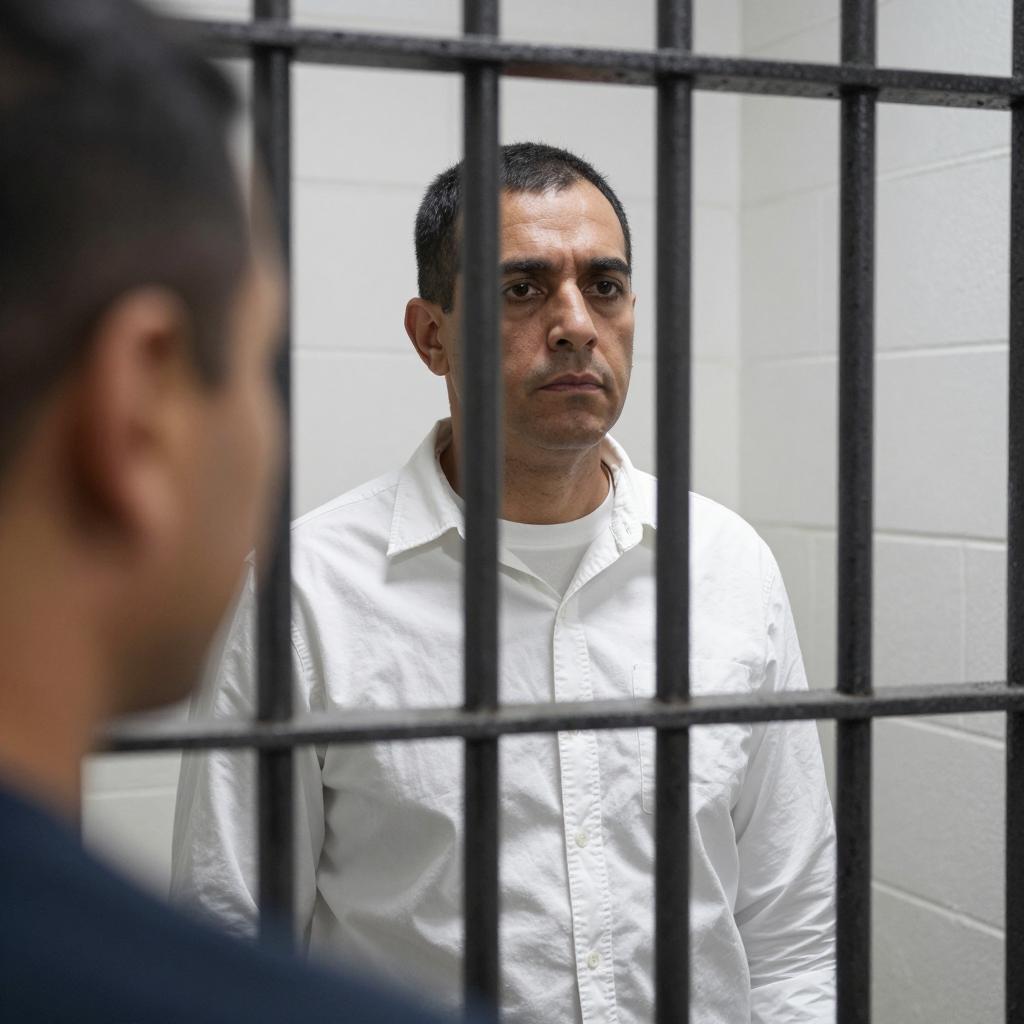 Photograph of a middle-aged man with short dark hair, white shirt, and white t-shirt, standing behind prison bars. White cinder block wall in background. Another person's blurred profile on left. Man's expression is neutral and serious.