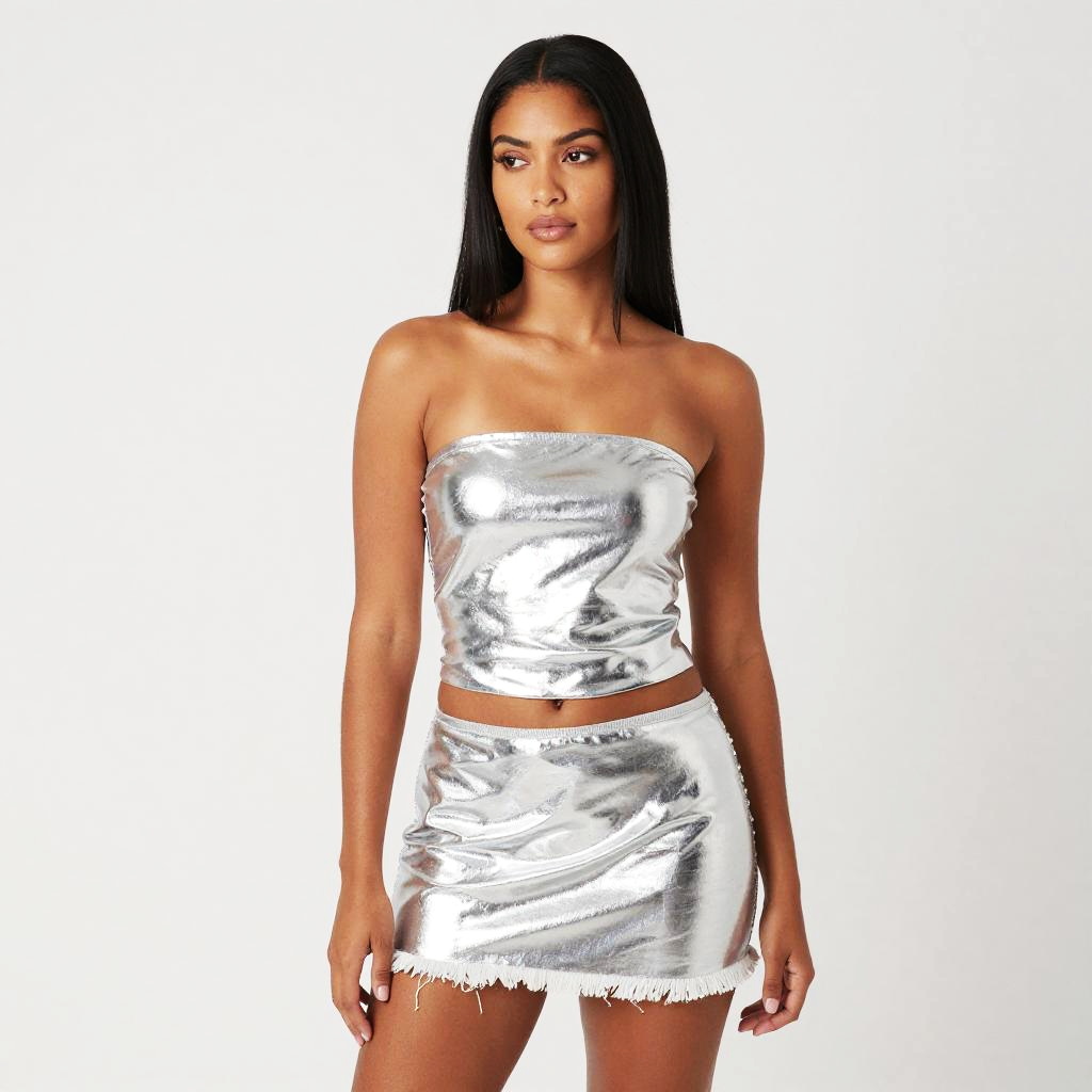 Photograph of a woman standing against a plain white background. She has long, straight black hair and is wearing a shiny, silver, strapless tube top and matching silver mini skirt with frayed edges. Her skin is tan, and she's looking slightly to the side with a neutral expression. The outfit reflects light, giving it a metallic sheen.