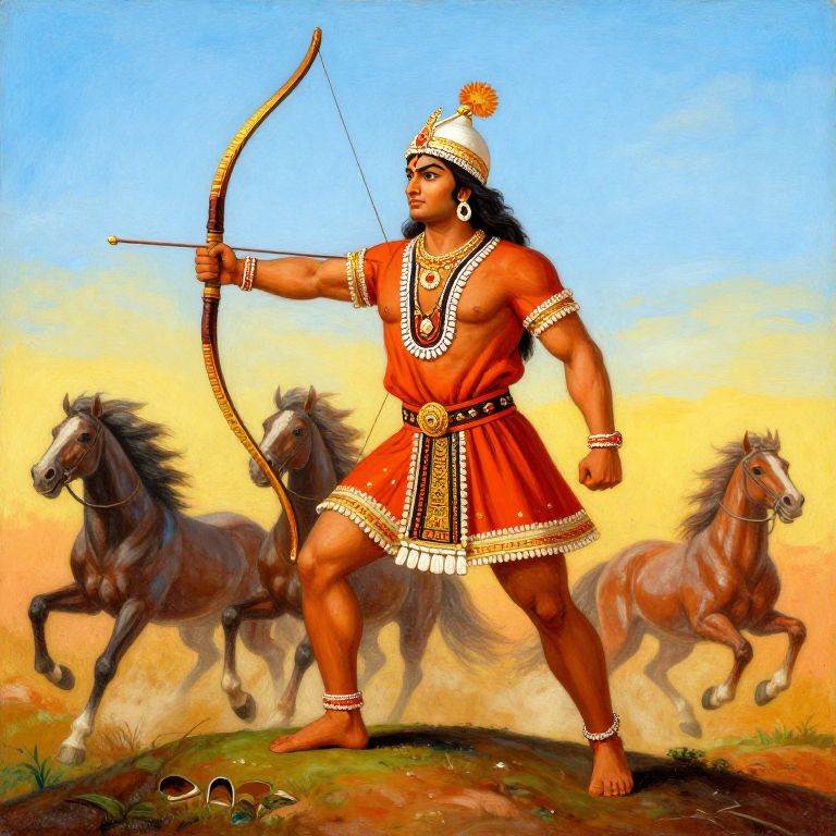 Indian warrior painting depicting a heroic figure in elaborate tribal attire, holding a decorated bow, standing atop a hill with wild horses galloping in the background, painted with vivid colors and intricate textures emphasizing bravery and culture.