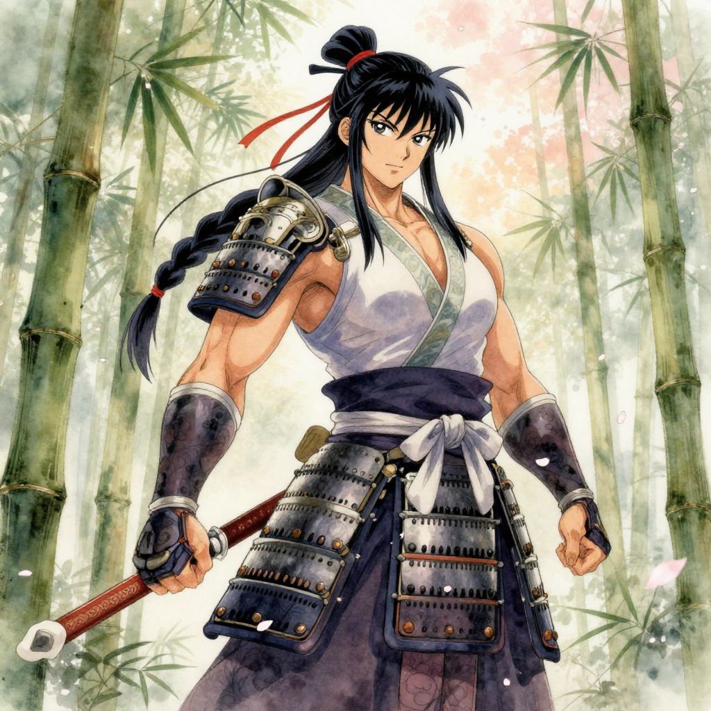 Muscular woman anime samurai in traditional armor, standing in a bamboo forest during dawn, poised and ready, powerful muscles visible under her attire, delicate cherry blossom petals falling around, watercolor-inspired anime art style with intricate detailing and soft pastel colors.