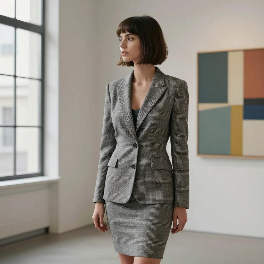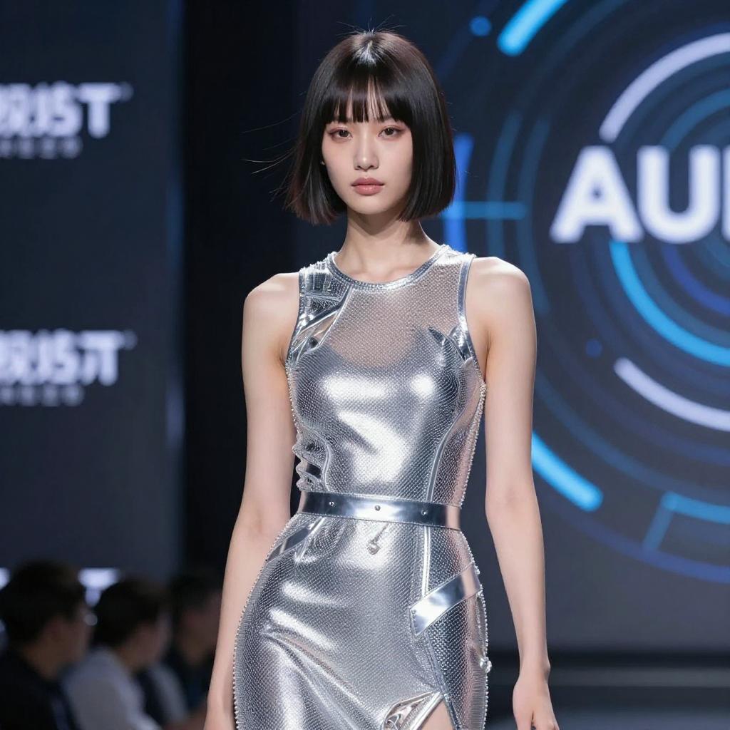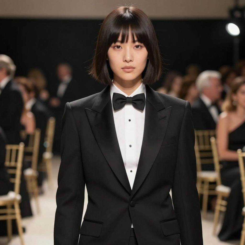 A-Line Bob hairstyle on fashion model, wearing bohemian embroidered maxi dress, in botanical garden, captured in fashion editorial style with soft morning glow.