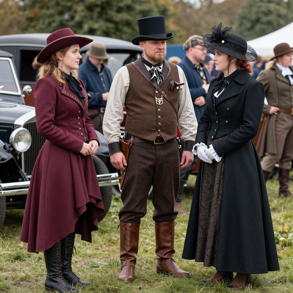 Participants dressed in elaborate steampunk attire gather outdoors during the Hereford Steampunk Weekend, featuring a woman in a maroon cowboy-inspired outfit with a wide-brimmed hat, a man in a brown vest and top hat with polished boots, and another woman in a black Victorian-style coat and matching hat, all surrounded by a bustling crowd and vintage cars.