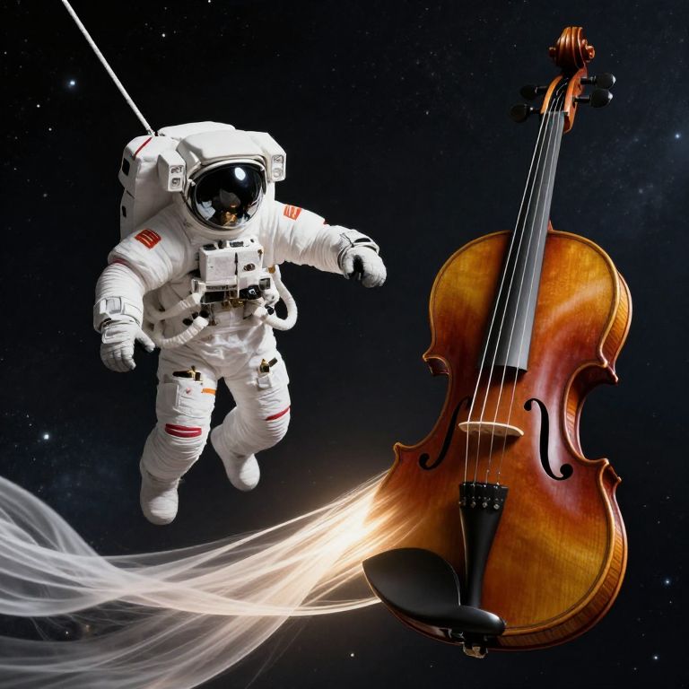 An astronaut floats in zero gravity, tethered not to a ship, but to a colossal, singing violin whose strings unravel into light and fabric.