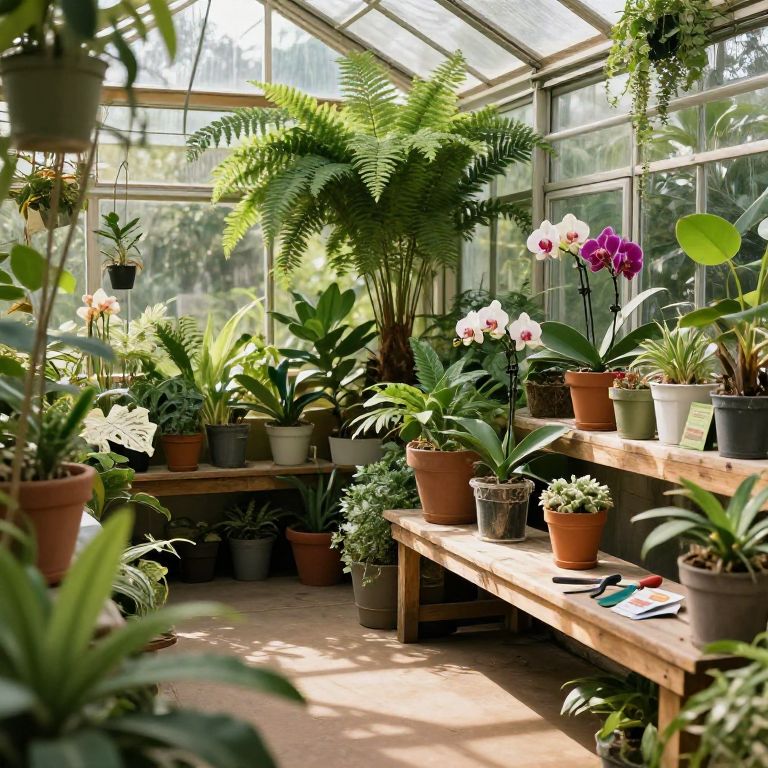 Jardinería showcasing a cozy indoor greenhouse filled with tropical plants, ferns and orchids in various pots, sunlight streaming through glass roof, wooden benches with gardening tools and seed packets, calm and inviting atmosphere, photographic realism