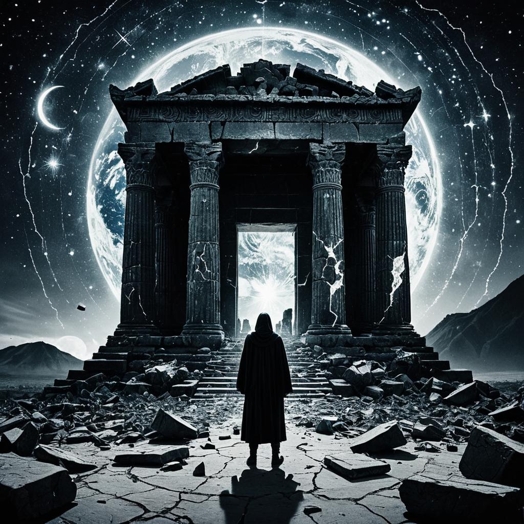 A dark-robed figure stands before a crumbling ancient temple surrounded by cracked stone and debris under a vast cosmic sky. The scene features a glowing full moon, crescent moon, and stars, symbolizing transformation and inner conflict. The atmosphere is surreal and melancholic, evoking themes of introspection and the fragile state of the world.