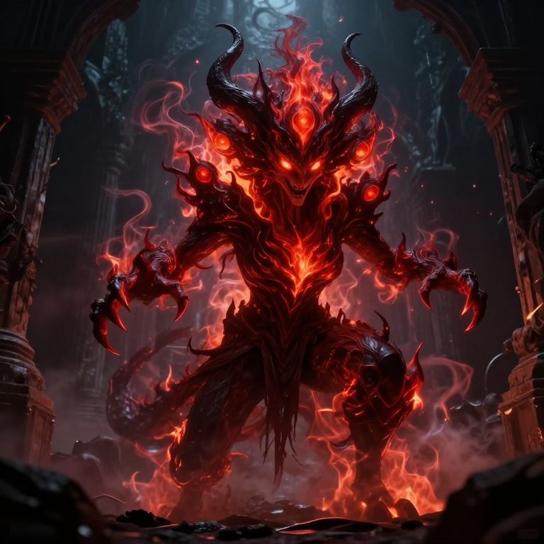 Digital artwork of a fiery, demonic creature with glowing red eyes, black horns, and glowing red flames enveloping its dark, twisted body in a dim