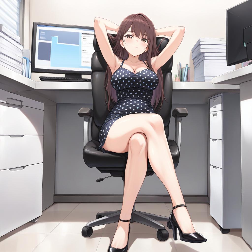 (Masterpiece:1.4), (high quality:1.2), (best quality:1.2), 1girl, solo, polka dot dress, wh1tep0lkadr3ss, sitting, high heels, crossed legs, office chair, office, indoors, computer. desk, arms behind head